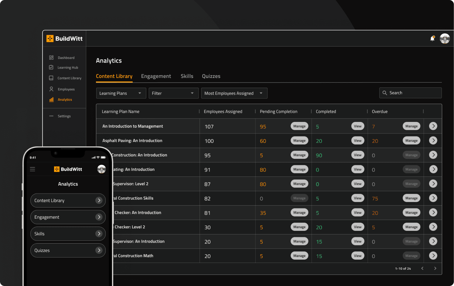 BuildWitt Training is a construction-focused Learning Management System (LMS) that helps crews upskill and stay compliant. It offers Learning Plans, Courses, and Lessons focused on workforce readiness and safety. However, the platform lacked any meaningful analytics—making it difficult for admins to monitor progress, identify issues, or take corrective action.